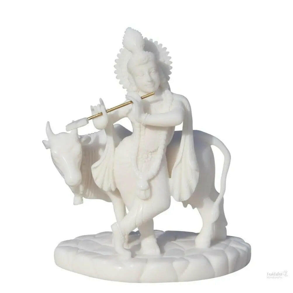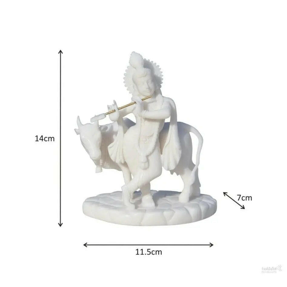 White Marble Finish Krishna with Cow Showpiece - 11.5 cm Elegant Rajasthani Art
