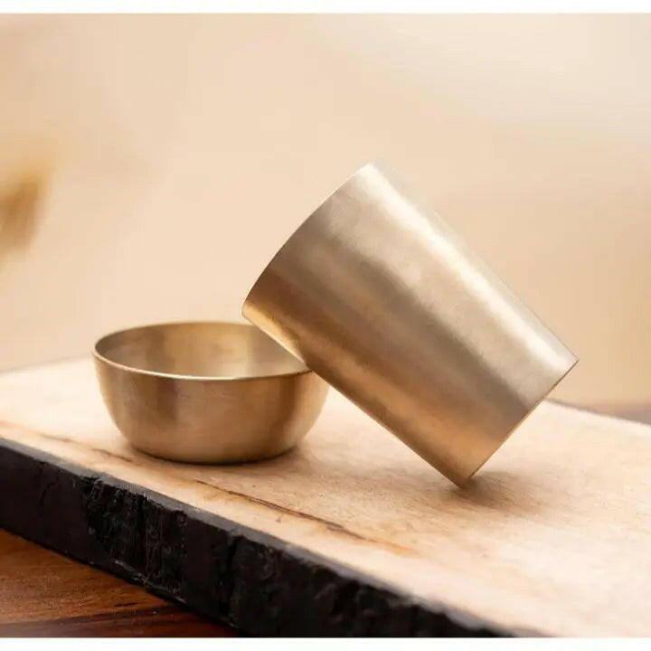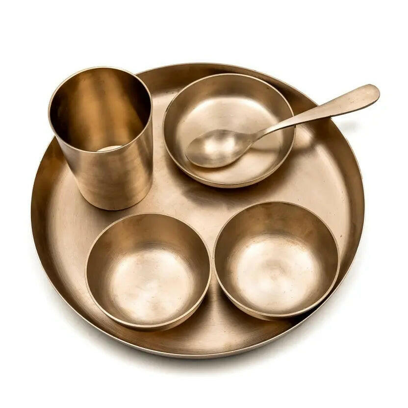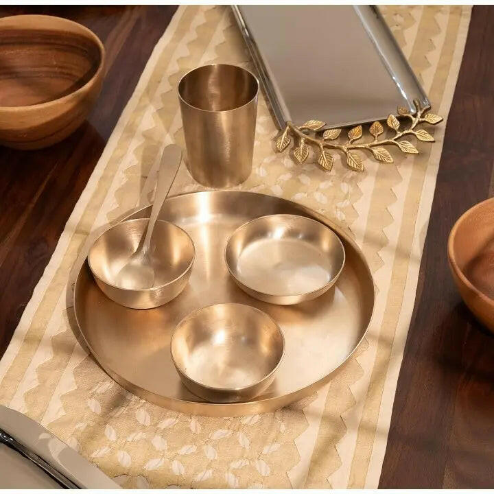 A perfect blend of ancient craftsmanship and modern elegance. Each meticulously handcrafted piece showcases the timeless brilliance of Kansa metal, enhancing not only your dining experience but also the health benefits associated with it. This complete dining set, designed for six people, includes beautifully crafted thalis, bowls, and glasses, all featuring a stunning matte finish that brings authenticity to your meals.